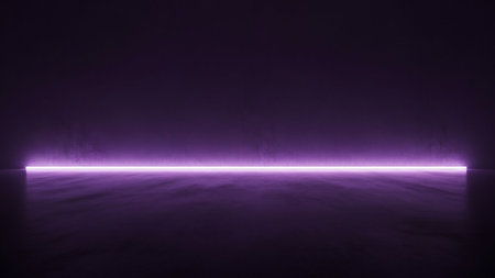 A stark, minimalist scene featuring a single, vibrant purple neon light strip diagonally bisecting the frame. The light casts a sharp glow on a rough, cracked concrete wall and a similarly textured floor. The background fades into deep blackness, creating a dramatic and atmospheric contrast. The clean lines of the neon and the rough texture of the concrete suggest a modern, industrial, or futuristic aesthetic.