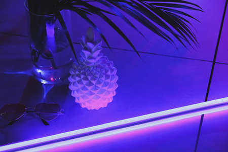 Ceramic pineapple with neon lamp, sunglasses and tropical leaf on dark color background