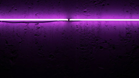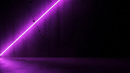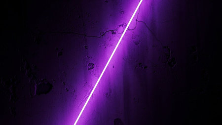 A stark and minimalist composition featuring a single, bright purple neon light strip diagonally crossing a dark, textured concrete wall. The wall exhibits cracks and imperfections, providing a rough contrast to the smooth, vibrant glow of the neon. The deep shadows and sharp contrast create a dramatic and atmospheric effect. is modern and abstract backgrounds.