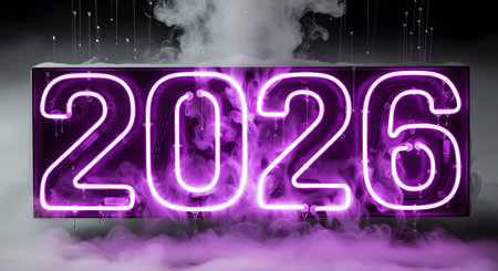 Neon chrome 2026 numbers with smoke and reflections on dark floor.
