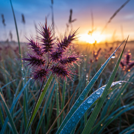 Close focus captures a single blade of grass glistening with dewdrops, set against a soft, colorful backdrop of blurred tones that evoke a serene, ethereal atmosphere.