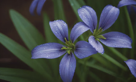 Close-up of Iris graminea with purple petals and striped details, visited by an ant. Symbol of biodiversity, wild flora and harmony between plants and insects.