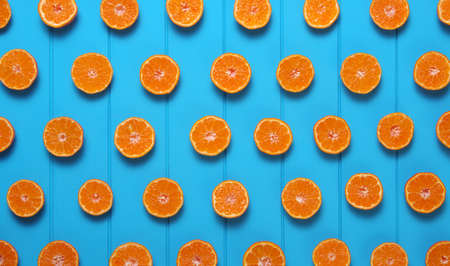 Fruit pattern of fresh orange slices on colored background. top view. copyspace. creative summer concept. Half of citrus in minimal flat lay.