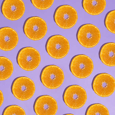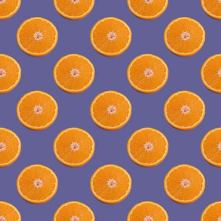 Sliced fruit oranges in checkered pattern on violet background. Fruit background from a slice of oranges. Demonstrating very peri, color of 2022 year.