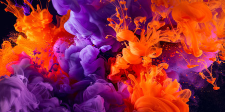 Vibrant purple and orange paint splashes creatively collide, forming an abstract display of color and motion against a soft blue backdrop.