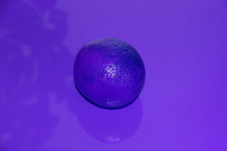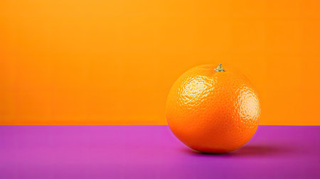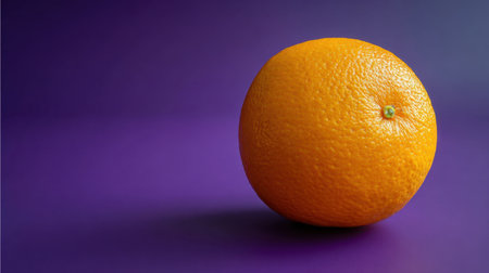 A fresh orange rests on a vibrant violet surface, showcasing its texture and color. This image captures the essence of healthy eating and freshness.
