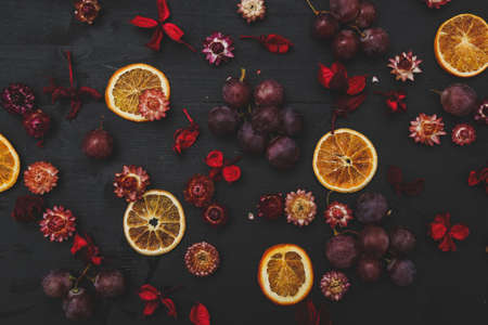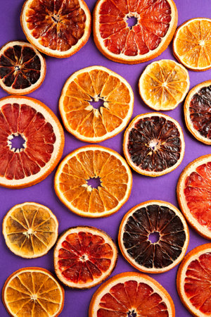 top view of dried orange and grapefruit slices arranged on purple background