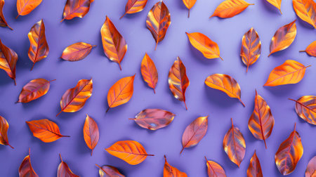 Orange leaves pattern on purple background. Flat lay, top view.