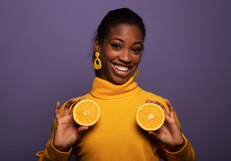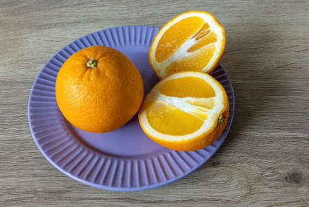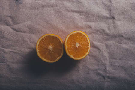 A ripe orange in half lies on a purple background