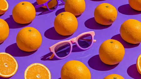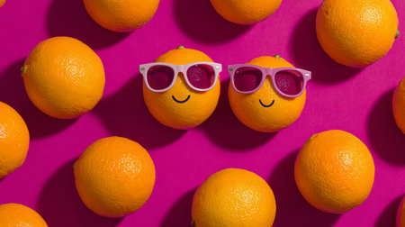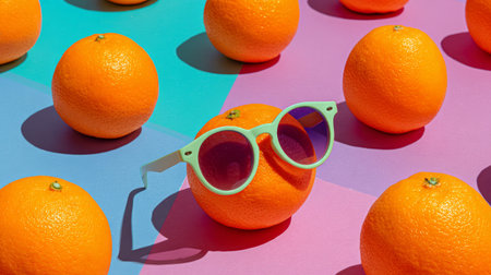 Artistic composition of oranges with stylish sunglasses on bright colorful backgrounds, minimal fun summer stock design