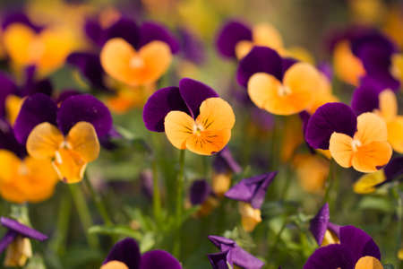 Violets and oranfe pansies close up view. Small depth of field.