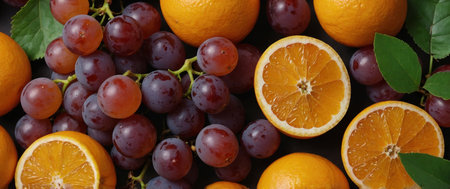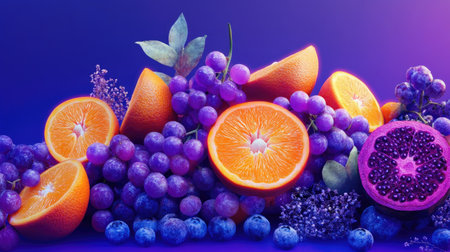 A close-up of a variety of fresh fruits, including a pomegranate, grapefruit, red grapes, and blueberries, with a vibrant purple and orange color palette.