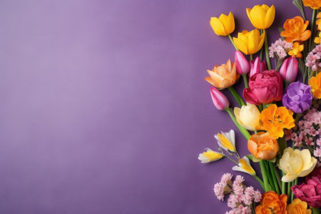 Grapefruit and spring flowers on a green background. Flat lay, top view. generative ai