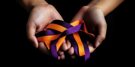 Generative AI : Close up hands holding the orb and Awareness ribbons of common cancer in the wood deskThreat from cancer Social campaign against cancer conceptElements of this imag