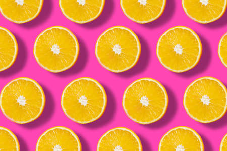 Top down view on pink abstract background with slices of ripe orange or lemon citrus in pattern - trendy minimal flat lay food summer concept