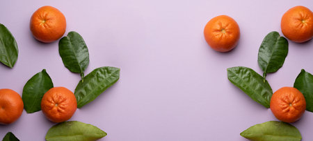 Fresh oranges and green leaves on a purple backdrop