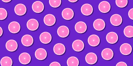 Seamless pattern pink citrus fruit orange lemon lying on violet surface. Colorful fresh citrus slice wallpaper. Creative vivid vibrant color, summer friuts concept. Minimal pop art style
