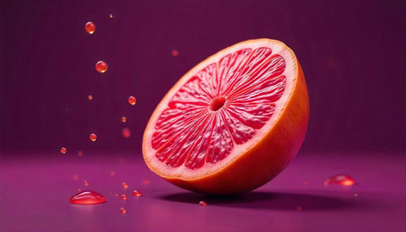 Vibrant grapefruit slice with juice droplets against purple background