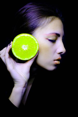 Young beautiful woman and orange portrait isolated over black