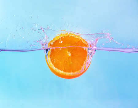 Falling of orange piece into water on light background