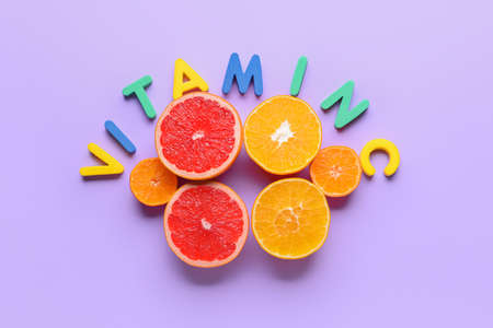 Text VITAMIN C and citrus fruits on color background