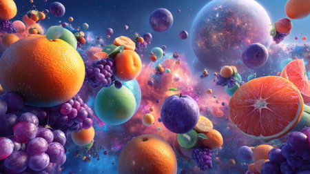An imaginative illustration of colorful fruits floating amid a cosmic backdrop, blending nature's beauty with surreal elements in a vibrant, captivating scene.