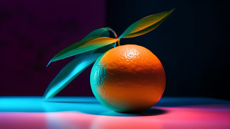 Orange with leaf on a dark background in neon light. Selective focus.