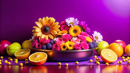 Vibrant flowers and fruit still life.