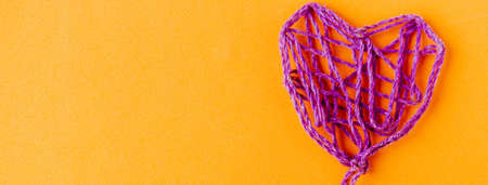 Purple thread handmade heart on bright orange background, copy space for the text