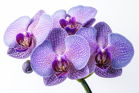 Explore the exquisite beauty of vibrant purple orchid blossoms set against a soft pastel blue background, perfect for floral aesthetics and design inspiration.