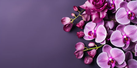 Pink orchids on a purple background, top view, space for text. High quality photo. Generative AI