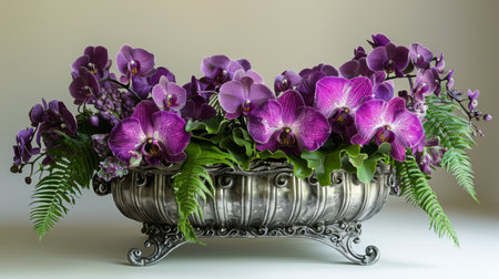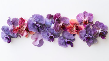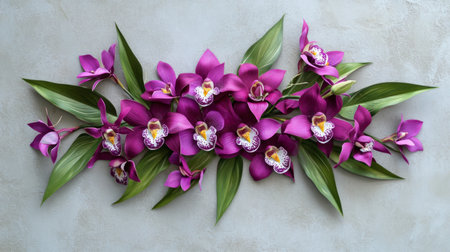 Purple orchids and green leaves arranged on a light gray background, modern and elegant generative ai