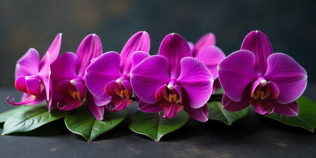 This image features a row of exquisite purple orchids in full bloom, set against a dark green background. The vivid purple petals are broad, with delicate veining, complemented by green leaves. Each flower appears elegant and symmetrical, creating a sense of exotic beauty and tranquility, perfect for a modern or tropical aesthetic. Aspect Ratio: 3:2.