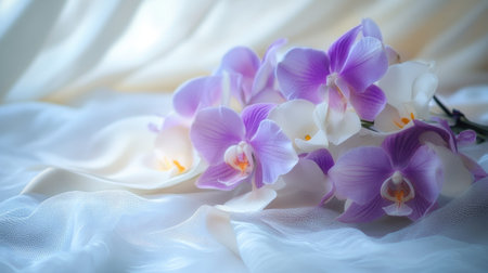 A stunning composition of purple and white orchids rests gracefully on soft drapery. This serene arrangement captures the delicate beauty of nature, perfect for various artistic and commercial projects.
