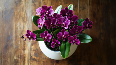 A stunning top view of vibrant purple orchids in a white pot, showcasing their beauty against a rustic wooden table. Perfect for home decor inspiration.