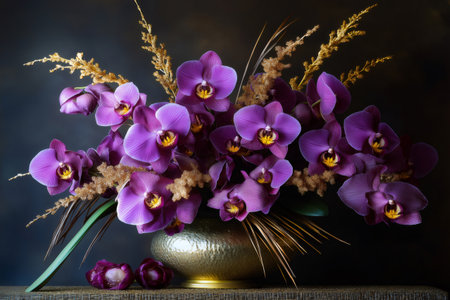 Luxurious still life with purple orchids and dried plants in golden vase on dark background