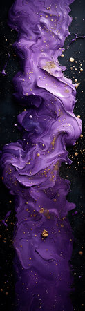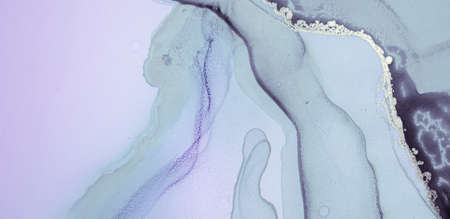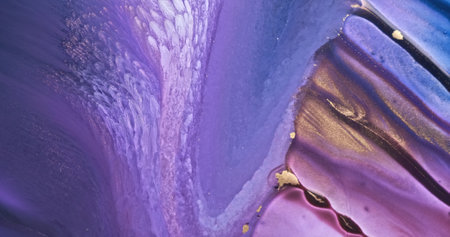 Lilac paint abstract flow. Gold violet art ink background. Shiny golden purple color flow liquid. Acrylic texture in motion. Colorful glitter fluid pattern. Beautiful vibrant backdrop