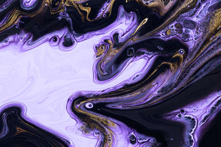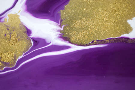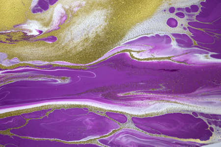 Purple abstract acrylic painting. Liquid marble texture with gold glitter.