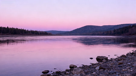 Calm river flowing between dark forest hills under a soft purple sky, creating a tranquil and atmospheric landscape