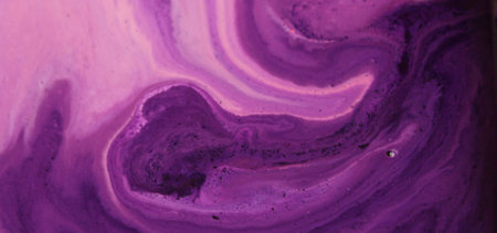 Liquid particles spill. Ink blend. Blur purple black color shimmering texture paint mix flow swirl abstract art background.