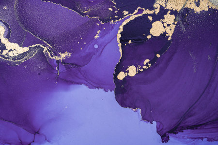 Mixed ink artwork texture. Liquid marble violet background with gold layers.