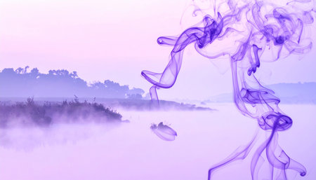 A field of vibrant purple flowers borders a serene lake reflecting a pastel-colored sky. The landscape features rolling hills and a light mist, suggesting an early morning setting. The image uses soft lighting and a balanced composition, suitable for various uses including environmental and natural themes.