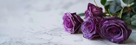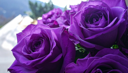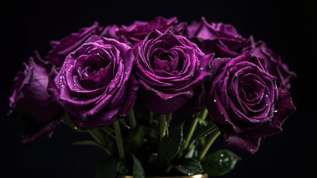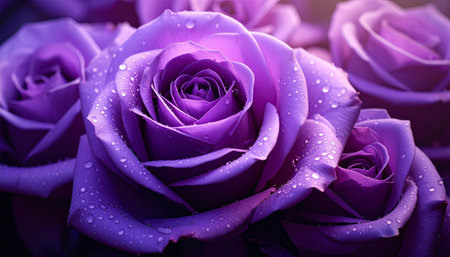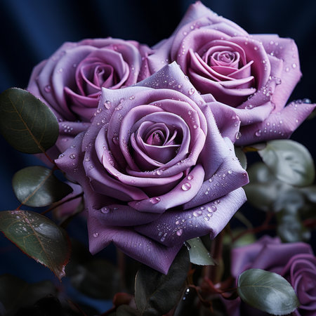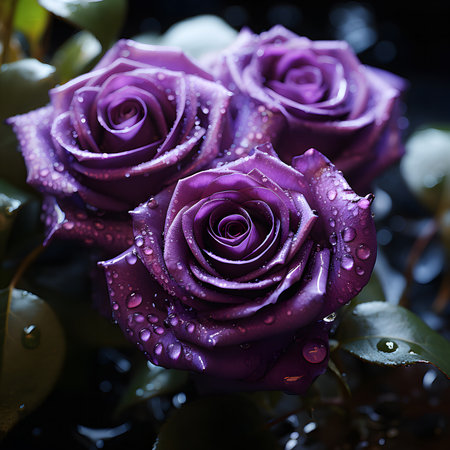 Three deep purple roses, glistening with morning dew, create a stunning display of natural beauty.