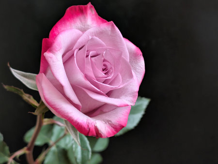 Beautiful fresh rose of pink color on a black background. Place for text. Photo for a greeting card.