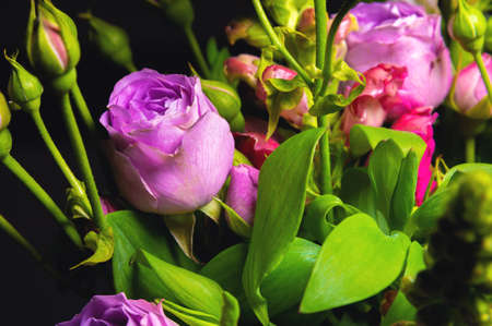 Bouquet of flowers consisting of tender lilac roses wrapped in a black paper in a flower shop