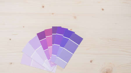 Variety of paint swatches with shades of purple pain on unfinished wooden background.