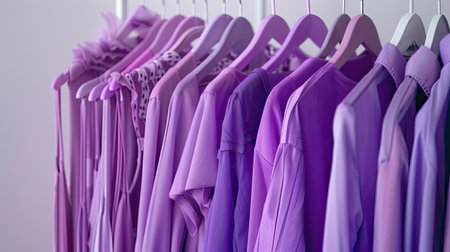 a rack adorned with clothes in various shades of purple against a pristine white background, inviting viewers into the world of style and sophistication