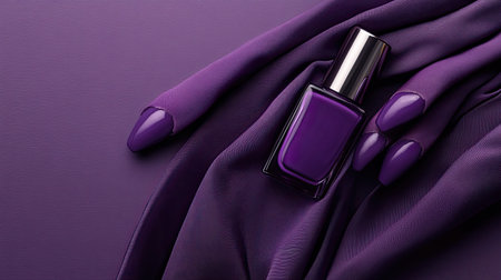 A creative shot of dark purple nails holding a nail polish bottle, surrounded by matching purple accents.