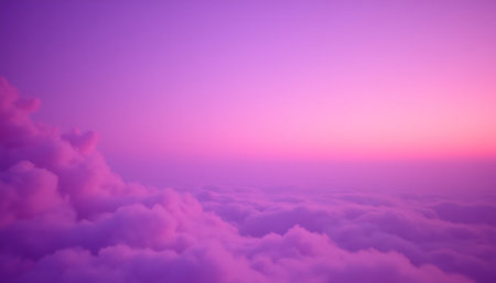 A mesmerizing view from above shows fluffy clouds bathed in the ethereal glow of a pink sunset sky.