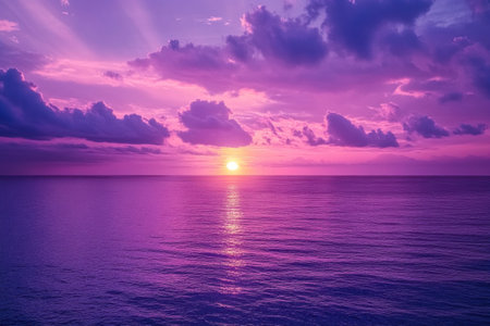 Captivating view of a stunning sunset over a calm ocean, featuring a vibrant palette of purple and pink hues across the sky. Perfect for inspiring tranquility.